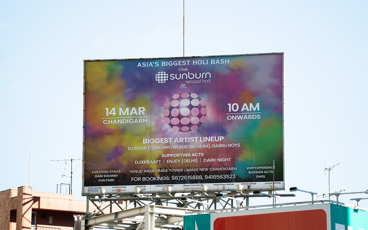 For the Holi Sunburn Chandigarh event, I designed artist posters to promote the lineup, large-format hoardings and venue signages for event visibility, and directional signage to guide attendees across the venue and kiosks for restaurant promotions ensuring consistency across digital and on-ground event collaterals.